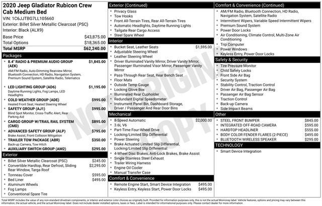 Northside Chevrolet Buick GMC is proud to offer this good-looking 2020 Jeep Gladiator Rubicon in Billet Silver Metallic Clearcoat, beautifully equipped with 8.4 Radio & Premium Audio Group (1-Year SiriusXM Guardian Trial, 5-Year SiriusXM Traffic Service, 5-Year SiriusXM Travel Link Service, Alpine Premium Audio System, Auto-Dimming Rear-View Mirror, Emergency/Assistance Call, For Details, Visit DriveUconnect.com, HD Radio, Radio: Uconnect 4C Nav w/8.4 Display, SiriusXM Traffic Plus, and SiriusXM Travel Link), Advanced Safety Group (Advanced Brake Assist and Full Speed Forward Collision Warning Plus), Auxiliary Switch Group (240 Amp Alternator, 700 Amp Maintenance Free Battery, and Auxiliary Switches), Cargo Group w/Trail Rail System (Exterior 115V AC Outlet and Lockable Rear Underseat Storage), Cold Weather Group (Heated Front Seats and Heated Steering Wheel), LED Lighting Group (Daytime Running Lamps LED Accents, Front LED Fog Lamps, LED Park Turn Lamps, LED Reflector Headlamps, and LED Taillamps), Safety Group (Blind Spot & Cross Path Detection and ParkSense Rear Park Assist System), Trailer Tow Package (Class IV Hitch Receiver, Heavy-Duty Engine Cooling, and Trailer Hitch Zoom), 4-Wheel Disc Brakes, 4.10 Rear Axle Ratio, 8 Speakers, 97 mph Maximum Speed Calibration, ABS brakes, Air Conditioning, Alloy wheels, AM/FM radio: SiriusXM, Apple CarPlay/Android Auto, Automatic temperature control, Bluetooth® Wireless Speaker, Body Color 3-Piece Hard Top, Body Color Fender Flares (2-Piece), Brake assist, Compass, Delay-off headlights, Driver door bin, Driver vanity mirror, Dual front impact airbags, Dual front side impact airbags, Electronic Stability Control, Freedom Panel Storage Bag, Front anti-roll bar, Front Bucket Seats, Front Center Armrest w/Storage, Front dual zone A/C, Front fog lights, Front reading lights, Fully automatic headlights, Garage door transmitter, Hardtop Headliner, Heated door mirrors, Illuminated entry, Integrated Off-Road Camera, Integrated roll-over protection, Leather steering wheel, Low tire pressure warning, No Soft Top, Occupant sensing airbag, Outside temperature display, Panic alarm, ParkView Rear Back-Up Camera, Passenger door bin, Passenger vanity mirror, Performance Suspension, Power door mirrors, Power steering, Power windows, Premium Cloth Low-Back Bucket Seats, Radio data system, Radio: Uconnect 4 w/7 Display, Rear anti-roll bar, Rear reading lights, Rear Sliding Window, Rear Window Defroster, Remote keyless entry, Remote Proximity Keyless Entry, Remote Start System, Roll-Up Tonneau Cover, Security system, Speed control, Split folding rear seat, Spray In Bedliner, Steel Front Bumper, Steering wheel mounted audio controls, Tachometer, Telescoping steering wheel, Tilt steering wheel, Traction control, Trip computer, Variably intermittent wipers, Voltmeter, and Wheels: 17 x 7.5 Granite Crystal Aluminum!