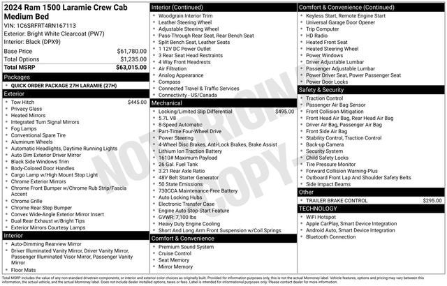 Northside Chevrolet Buick GMC is pleased to offer this charming 2024 Ram 1500 Laramie in Bright White Clearcoat, beautifully equipped with Quick Order Package 27H Laramie, 10 Speakers, 3 Rear Seat Head Restraints, 3.21 Rear Axle Ratio, 4 Way Front Headrests, 4-Wheel Disc Brakes, 48V Belt Starter Generator, 4G LTE Wi-Fi Hot Spot, ABS brakes, Active Noise Control System, Air Conditioning, Alloy wheels, AM/FM radio: SiriusXM with 360L, Anti-Spin Differential Rear Axle, Apple CarPlay, Apple CarPlay/Android Auto, Audio memory, Auto-dimming door mirrors, Auto-Dimming Exterior Driver Mirror, Auto-dimming Rear-View mirror, Automatic temperature control, Brake assist, Bumpers: chrome, Chrome Exterior Mirrors, Class IV Receiver Hitch, Compass, Connected Travel & Traffic Services, Connectivity - US/Canada, Convex Wide-Angle Exterior Mirror Insert, Delay-off headlights, Driver door bin, Driver Seat Memory, Driver vanity mirror, Dual front impact airbags, Dual front side impact airbags, Dual Rear Exhaust w/Bright Tips, Electronic Stability Control, Exterior Mirrors Courtesy Lamps, Exterior Mirrors w/Heating Element, Exterior Mirrors w/Memory, Exterior Mirrors w/Supplemental Signals, For Details, Visit DriveUconnect.com, For More Info, Call 800-643-2112, Front anti-roll bar, Front Center Armrest w/Storage, Front dual zone A/C, Front fog lights, Front reading lights, Front Seat Back Map Pockets, Front wheel independent suspension, Fully automatic headlights, Garage door transmitter, Global Telematics Box Module (TBM), Google Android Auto, GPS Navigation, HD Radio, Heated door mirrors, Heated Front Seats, Heated front seats, Heated Steering Wheel, Heated steering wheel, Heavy-Duty Engine Cooling, HEMI Badge, Illuminated entry, Integrated Voice Command w/Bluetooth®, Leather steering wheel, Leather Trim 40/20/40 Bench Seat, Low tire pressure warning, Memory seat, Navigation System, Occupant sensing airbag, Outside temperature display, Overhead airbag, Overhead console, Panic alarm, ParkView Rear Back-Up Camera, Passenger door bin, Passenger vanity mirror, Power 2-Way Driver Lumbar Adjust, Power 2-Way Passenger Lumbar Adjust, Power 8-Way Driver & Passenger Seats, Power door mirrors, Power driver seat, Power passenger seat, Power steering, Power windows, Power-Folding Mirrors, Radio data system, Radio: Uconnect 5 Nav w/8.4 Display, RAM Grille Badge - Chrome, Rear 60/40 Folding Seat, Rear anti-roll bar, Rear seat center armrest, Rear step bumper, Remote keyless entry, Security system, SiriusXM Radio Service, SiriusXM w/360L, Speed control, Split folding rear seat, Steering wheel mounted audio controls, Tachometer, Telescoping steering wheel, Tilt steering wheel, Traction control, Trailer Brake Control, Trip computer, Turn signal indicator mirrors, USB Host Flip, Variably intermittent wipers, Ventilated Front Seats, Ventilated front seats, Voltmeter, and Wheels: 18 x 8 Aluminum Base Painted! Odometer is 23024 miles below market average! Priced below KBB Fair Purchase Price!