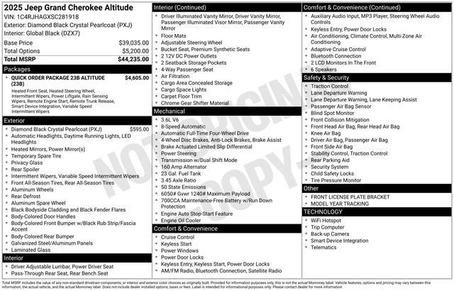 Diamond Black Crystal Pearlcoat 2025 Jeep Grand Cherokee Altitude 4WD 8-Speed Automatic 3.6L V6 24V VVT
